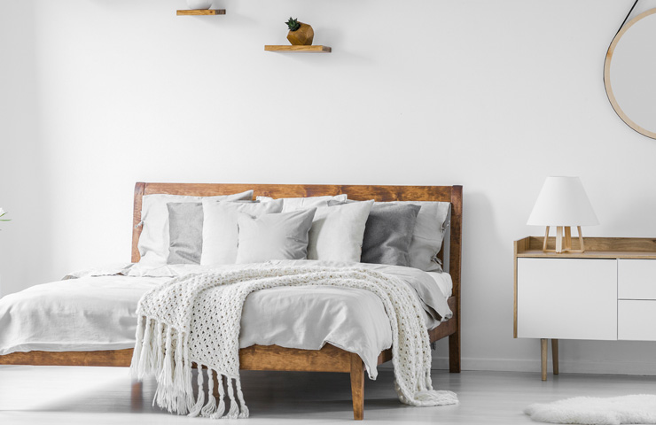 Comfortable big wooden framed bed with linen, pillows and blanket, nightstand beside and round mirror hanging on a white wall in a bright bedroom interior. Real photo.